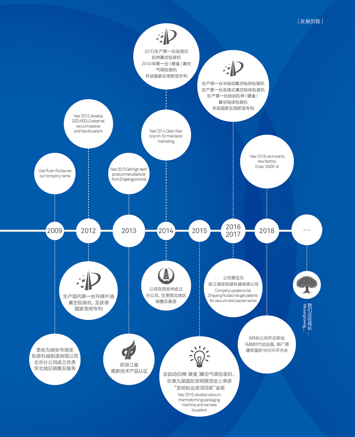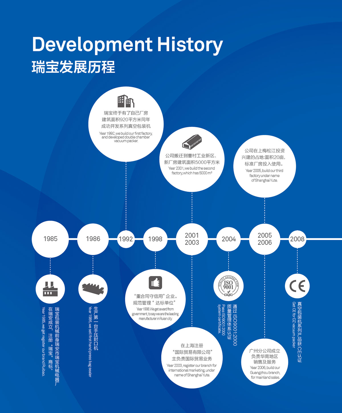 自创立之日起,瑞宝一直以优秀的品质及最具竞争力的价格为广大客户提供高素质的服务,经过三十多年不断学习,在稳定中不断发展壮大,多项技术获得国家专利及用户好评。瑞宝已成为国内有影响的包装机械制造商之一。目前在浙江、上海、北京、广州、西安共拥有五家生产基地和分部。连同国内外主要城市的60多家经销服务网络体系为国内用户提供迅捷、周到、专业的服务。