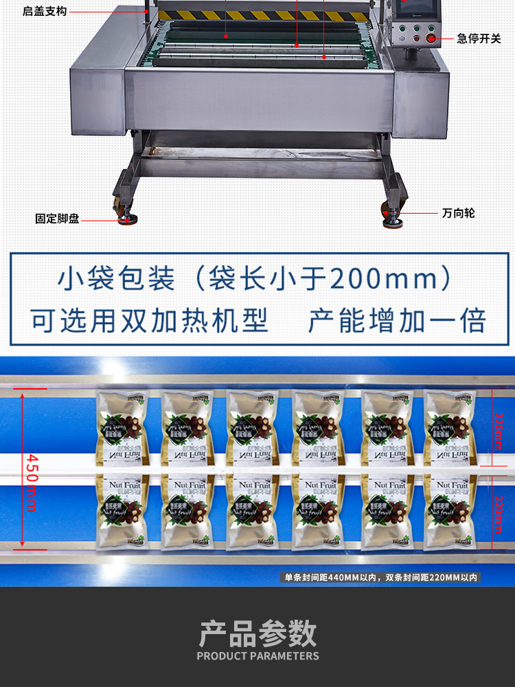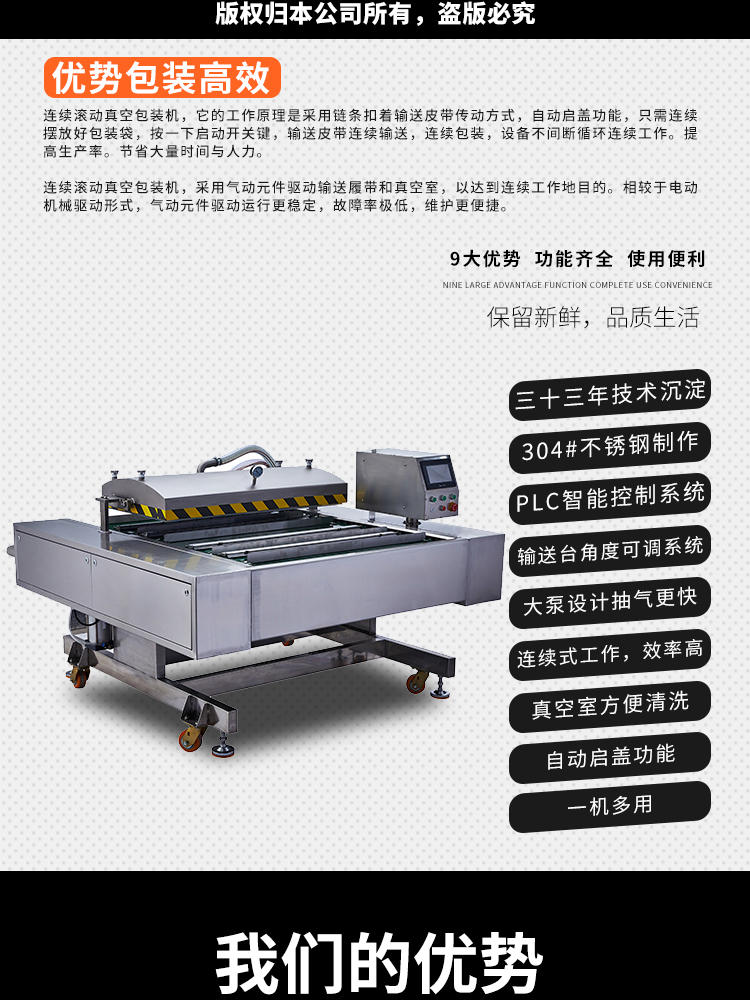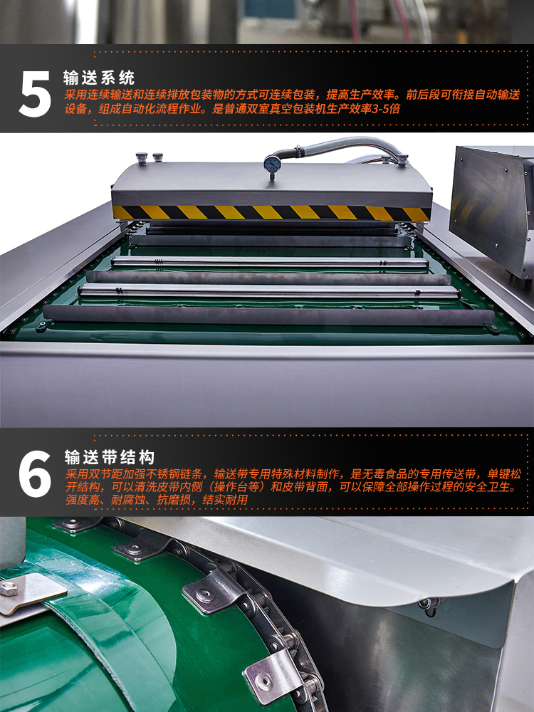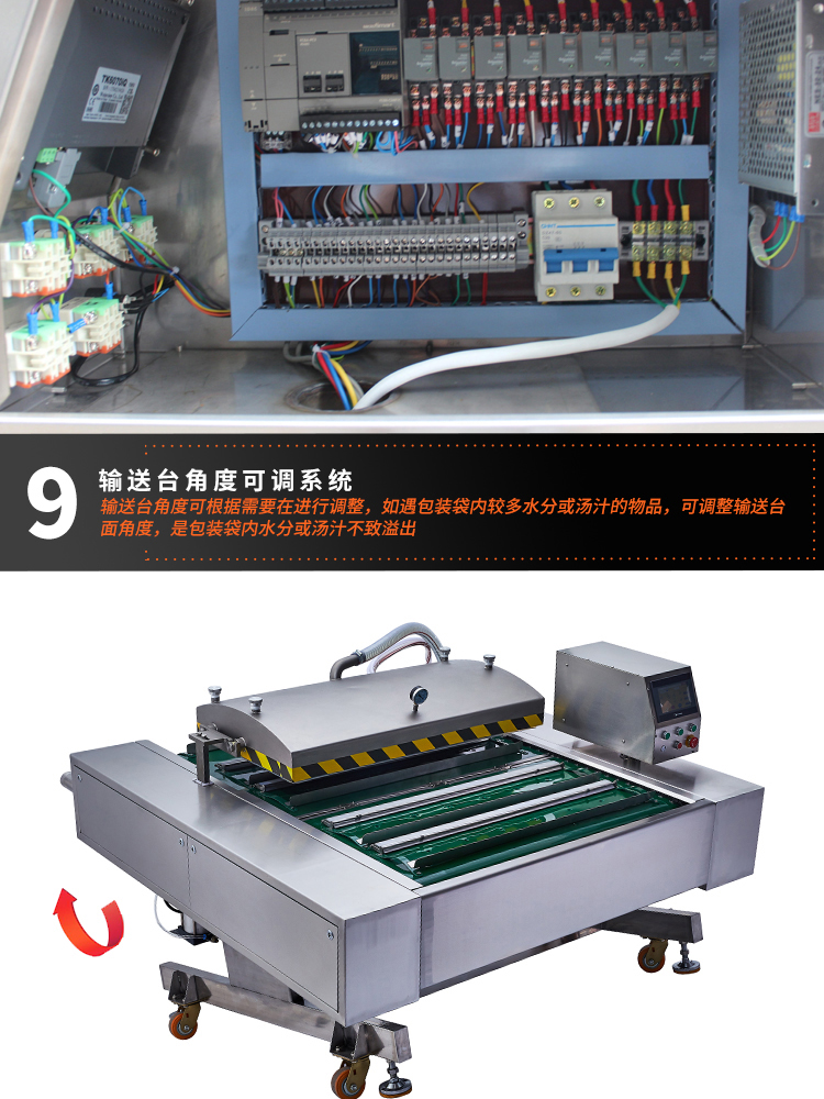 ·遇包装袋内较多水份或汤汁的物品,可调整输送台面角度,使包装袋内水份或汤汁不致溢出。