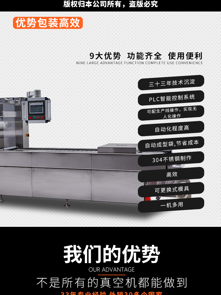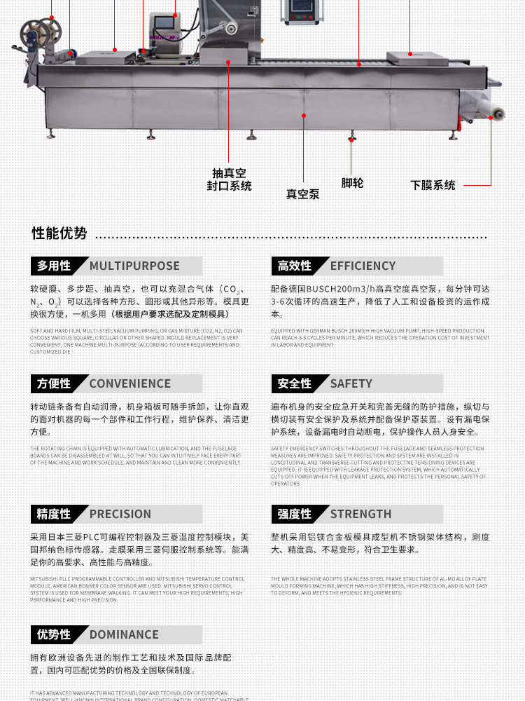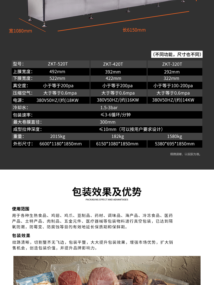 ? 热成型真空包装,将包装内的空气抽出,降低包装内的氧气含量,抑制好氧菌的繁殖,同时避免了食品因与外界环境接触而噪造成的卫生污染,有效的延长了鲜肉的货架期。除了除氧保质的功效外,食品真空包装还具有抗压、阻气、保鲜等作用,能更有效地使食品长期保持原有的色、香、味、形及营养价值。